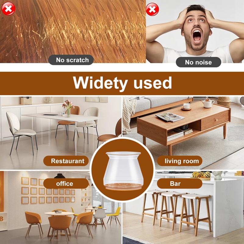 Just slide the silicone caps onto chair legs — no glue, nails, or measuring required. Much safer and more reliable than sticky pads that loosen over time.