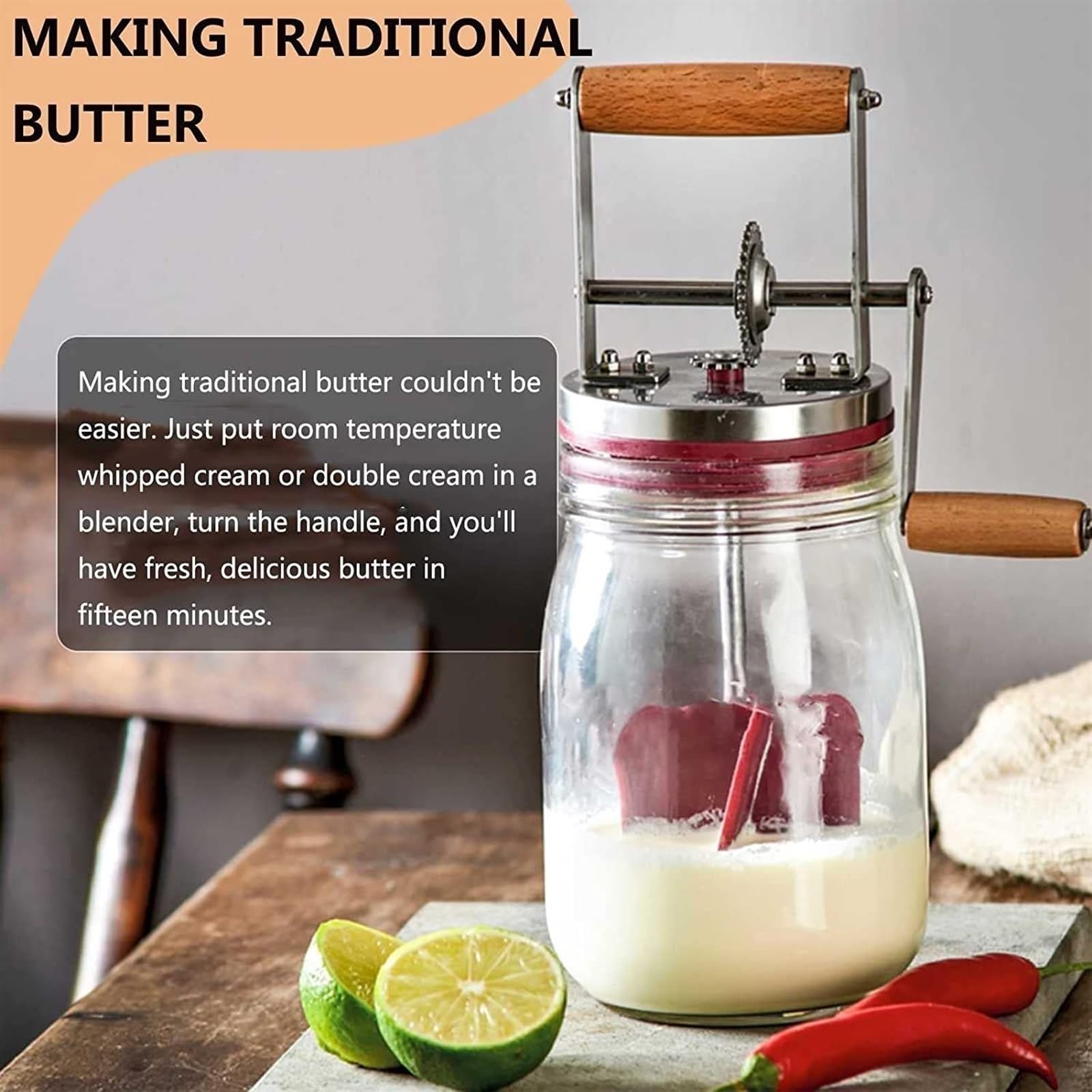 Equipped with a smooth wooden handle and durable glass jar, it lets you turn ordinary cream into rich, golden butter in just minutes. Perfect for anyone who loves homemade goodness, rustic style, and hands-on kitchen fun! 🍶✨